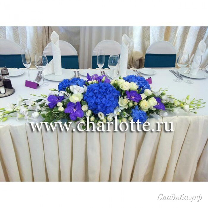 Композиция на президиум в бело-синих тонах из синей гортензии, орхидеи "Ванда", белых роз, белых лизиантусов, орхидеи дендробиум с декоративной зеленью. По Вашему желанию цветовую гамму композиции можно изменить, для этого звоните в наш салон цветов.