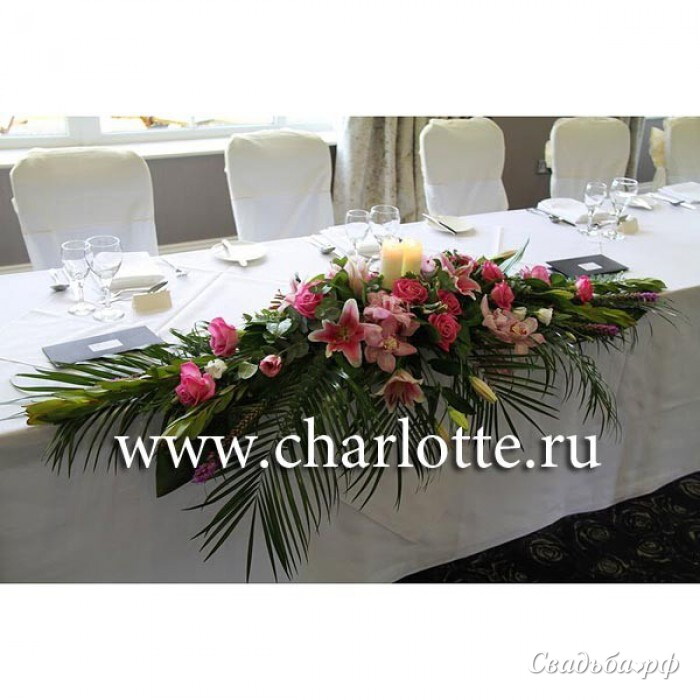 Композиция в розовых тонах из роз Аква, лиатрисов, орхидей цимбидиум, розовых восточных лилий с декоративной зеленью. Размер такой композиции 120 см.