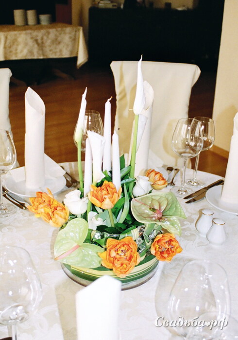 Оригинальна настольная композиция из махровых тюльпанов, белых калл, антуриумов и листьев пандануса