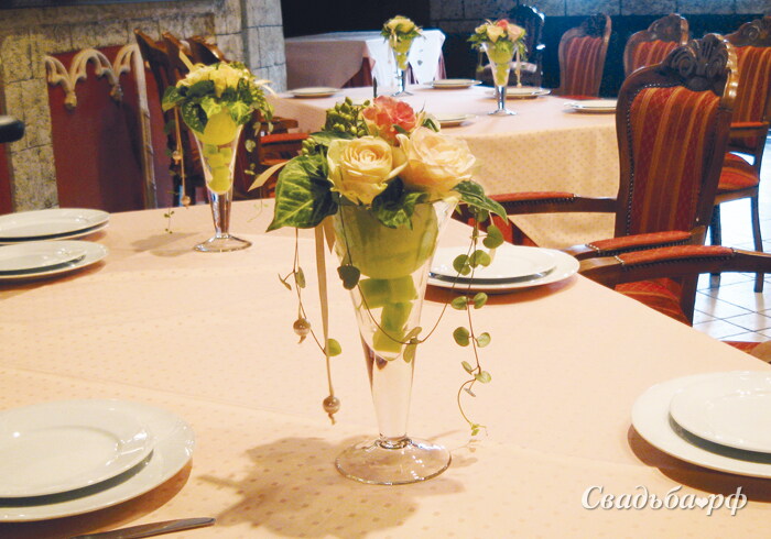 Изящные настольные композиции в бокалах из кремовых роз, тиляндсии, гиперикума с лентами и жемчужинами.