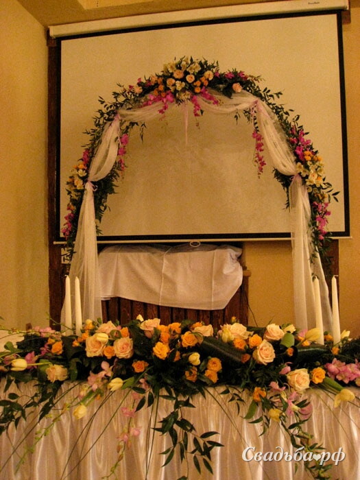 Настольная композиция из сиреневых орхидей, кремовых роз и кустовых роз, тюльпанов и альстромерии. Арка позади стола молодоженов украшена драпировкой из легкой ткани и композициями из роз, орхидей и альстромерии с зеленью рускуса итальянского
