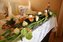 Оригинальная композиция в современном стиле на стол молодоженов из зеленых антуриумов, оранжевых тюльпанов и кремовых роз в ажурной, стеклянной вазе.