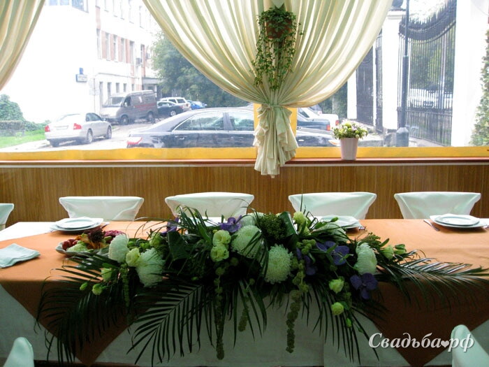 Композиция на стол молодоженов из белых хризантем, лизиантуса и орхидеи Ванда, с листьями пальмы и амарантусом.