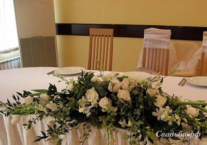 Нежная, романтическая композиция для стола молодоженов в бело-зеленой гамме из роз, орхидей, тюльпанов и зелени.