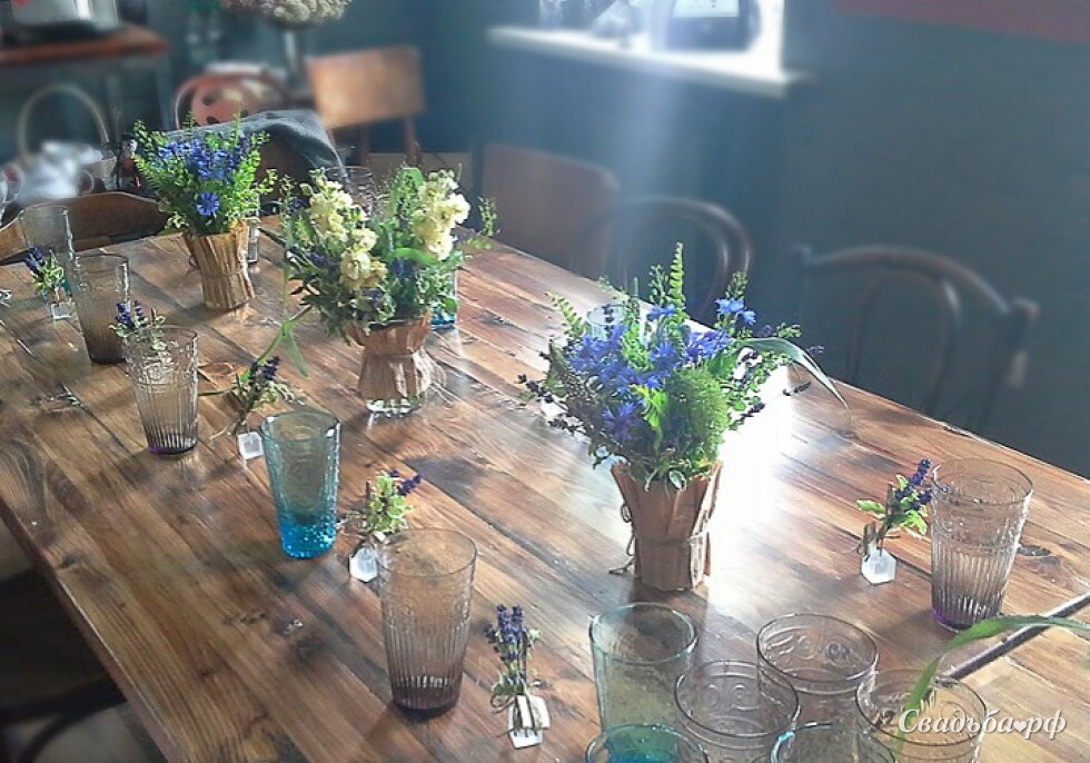 Оформление праздничного стола в стиле "Прованс". Букеты из васильков, "пастушьей сумки", питтоспорума, матиолы, лаванды, цетарии, лизимахии, и разнообразной зелени.