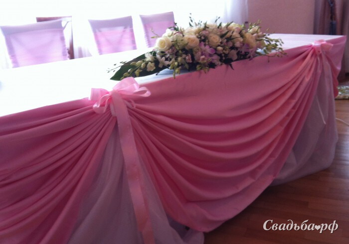 Оформление президиума тканью и цветочными композициями! На данном фото представлен классический пример оформления. Наша творческая команда оформит Ваш праздник в любом направлении и стиле!