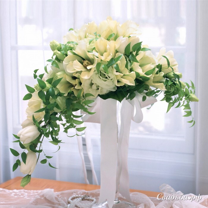 Белоснежная композиция на стол для гостей из лилии и тюльпанов.