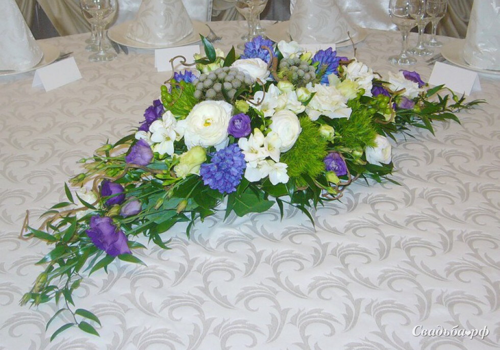 Горизонтальная композиция, размер: 70х25 см. Классическое цветочное оформление свадебного стола для гостей. Композиция декорирована воздушными весенними цветами и зеленью: роскошный голубой гиацинт, чье название с греческого переводится как "цветок дождей", нежный ранункулюс, итальянский рускус, фрезия и другие.