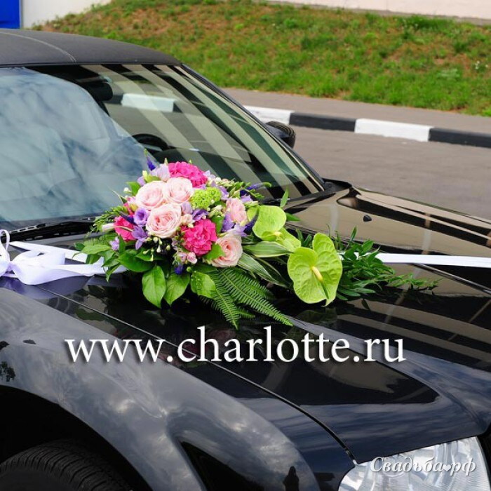 Композиция из роз, гортензий, антуриумов, вибурнума, лизиантусов, гипсофилы с декоративной зеленью. Ручки авто украшены так же живыми цветами и лентами.