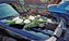 Эффектная, современная композиция на машину из белых антуриумов и орнитогалума с резными листьями алокасии и стрелиции.