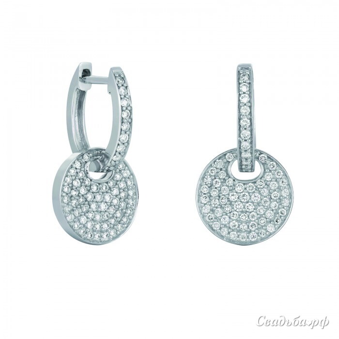 Роскошные серьги с английской застёжкой и вставкой-монеткой выполнены ведущими испанскими ювелирами из белого золота 750 пробы. Украшения буквально усыпаны чистейшими бриллиантами безупречной огранки. Изделия удобно сидят на ушке. Такие серьги станут отличным комплектом к Вашему обручальному колечку из аналогичного металла.
