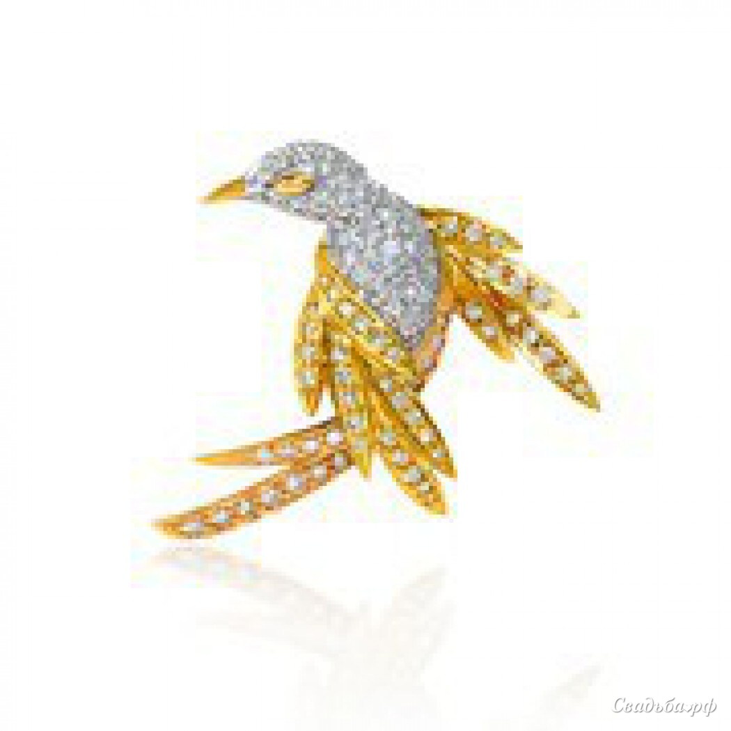 Оригинальная брошь- птичка для невесты из белого и желтого золота с бриллиантами.