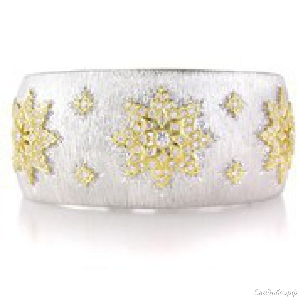 Оригинальный крупный браслет со звездами из белого и желтого золота с бриллиантами изысканно подчеркнет любой подвенечный наряд.