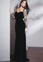 Длинное вечернее платье из благородного черного бархата. Особенностью данного наряда являются рукава из шифона телесного цвета, которые декорированы хаотичными узорами из бисера и декоративных камней. Линия декольте достаточно сдержанная, плечи закрыты. Платье элегантно облегает фигуру до середины бедер и заканчивается небольшим шлейфом.