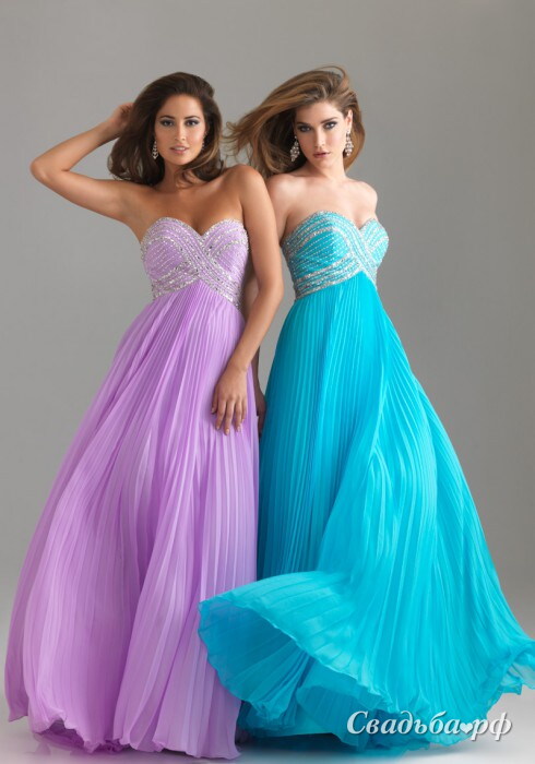 Струящееся вечернее платье из новой коллекции 2014 года просто создано для летнего торжества. Лёгкая ткань, свободный фасон и кокетливая плиссировка помогут создать знойный образ роковой красотки. Сверкающая вышивка и открытая зона декольте привлекают внимание к бюсту. Длинная юбка с завышенной талией струится до самого пола.