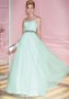 Романтичное вечернее платье оригинального мятного цвета. Модель выполнена из легкой полупрозрачной ткани. Открытый фигурный лиф украшен драпировкой. По линии талии проходит декоративный пояс серебристого цвета из бисера и бусин. Широкая пышная юбка похожа на воздушное мятное суфле из какого-то изысканного французского десерта.