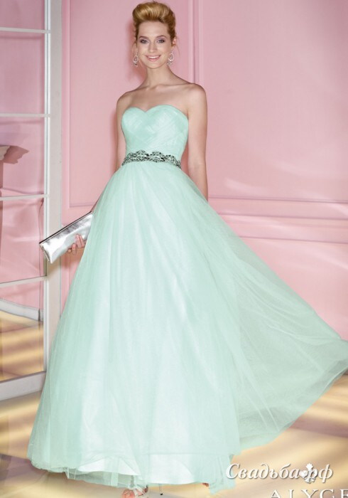 Романтичное вечернее платье оригинального мятного цвета. Модель выполнена из легкой полупрозрачной ткани. Открытый фигурный лиф украшен драпировкой. По линии талии проходит декоративный пояс серебристого цвета из бисера и бусин. Широкая пышная юбка похожа на воздушное мятное суфле из какого-то изысканного французского десерта.