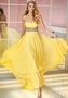 Очаровательное вечернее платье из тончайшего шифона весёлого жёлтого цвета. Открытый лиф украшен драпировкой. Линия талии выделена широким серебристым поясом, расшитым бисером, бусинами и стразами. Настолько изысканное и, в то же время, романтичное платье идеально подойдёт и для выпускного бала, и для любого другого торжества.