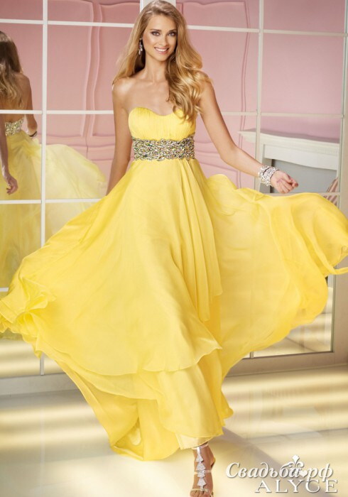 Очаровательное вечернее платье из тончайшего шифона весёлого жёлтого цвета. Открытый лиф украшен драпировкой. Линия талии выделена широким серебристым поясом, расшитым бисером, бусинами и стразами. Настолько изысканное и, в то же время, романтичное платье идеально подойдёт и для выпускного бала, и для любого другого торжества.