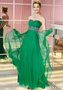 Изысканно и утончённо выглядит вечернее платье насыщенного зелёного цвета. Модель выполнена из лёгкой полупрозрачной ткани. Лиф украшен искусной драпировкой. Линия талии выделена декоративным поясом из бисера и стразов. Этот пояс даёт начало широкой длинной юбке, состоящей из нескольких слоёв и соблазнительно окутывающей женскую фигурку.