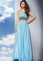 Очаровательное вечернее платье из нежно-голубого полупрозрачного шифона. Искусная густая драпировка украшает открытый фигурный лиф. Широкий пояс из сверкающих больших стразов эффектно подчёркивает линию талии. Многослойная длинная и очень широкая юбка красиво струится вдоль фигуры и ниспадает на пол, к ногам прекрасной дамы.