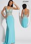 Романтичное вечернее платье нежного голубого цвета. Глубокий V-образный вырез и открытая спина выглядят весьма соблазнительно. Верхняя часть модели выполнена из сетчатой ткани с очень красивыми объёмными вышитыми узорами из бисера и бусин. Длинная, слегка расширенная книзу юбка спокойно струится вдоль фигуры и ниспадает на пол небольшим шлейфом.