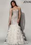 Эффектное вечернее платье со стразами и перьями. Верхняя часть модели представляет собой открытый фигурный лиф и удлинённый корсет, полностью расшитые стразами. Расширенная книзу юбка задекорирована воздушными перьями, благодаря чему образ получается роскошным и кокетливым одновременно. Платье также подойдёт в качестве свадебного наряда.