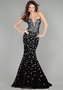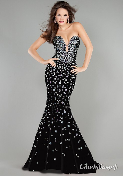 Элегантное вечернее платье классического чёрного цвета. Лиф с глубоким фигурным вырезом эффектно подчёркивает соблазнительность зоны декольте. Длинная юбка расширяется книзу. Крупные сверкающие стразы на фоне чёрной ткани смотрятся особенно изысканно и делают платье похожим на наряд какой-то сказочной волшебницы или Царицы ночи.