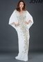 Изысканное вечернее платье типа кимоно классического белого цвета. Элегантный V-образный вырез подчёркивает соблазнительность зоны декольте. Роскошная вышивка серебристыми сверкающими стразами и бусинами украшает переднюю часть модели. Платье также легко справится с ролью оригинального свадебного наряда для стильной и смелой невесты.