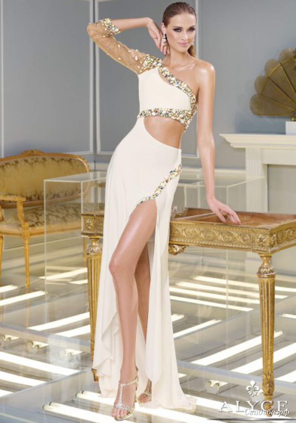 Эффектный вечерний наряд от известного бренда Alyce Paris отличается оригинальным дизайном и безупречным исполнением. Ассиметричный верх платья и единственный длинный рукав придают образу особый шик. Вырез на талии является изюминкой модели. Длинная юбка с глубоким разрезом струится до пола. Платье украшено сверкающей вышивкой.