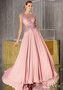 Роскошное платье нежного розового цвета может похвастаться безупречным А-силуэтом и стильным дизайном. Верх платья вручную расшит бисером и стразами. Закрытая зона декольте и плечики придают образу изысканность. Длинная юбка с мягкими сборками расширяется к полу. Такой наряд подойдёт даже для самого торжественного случая.