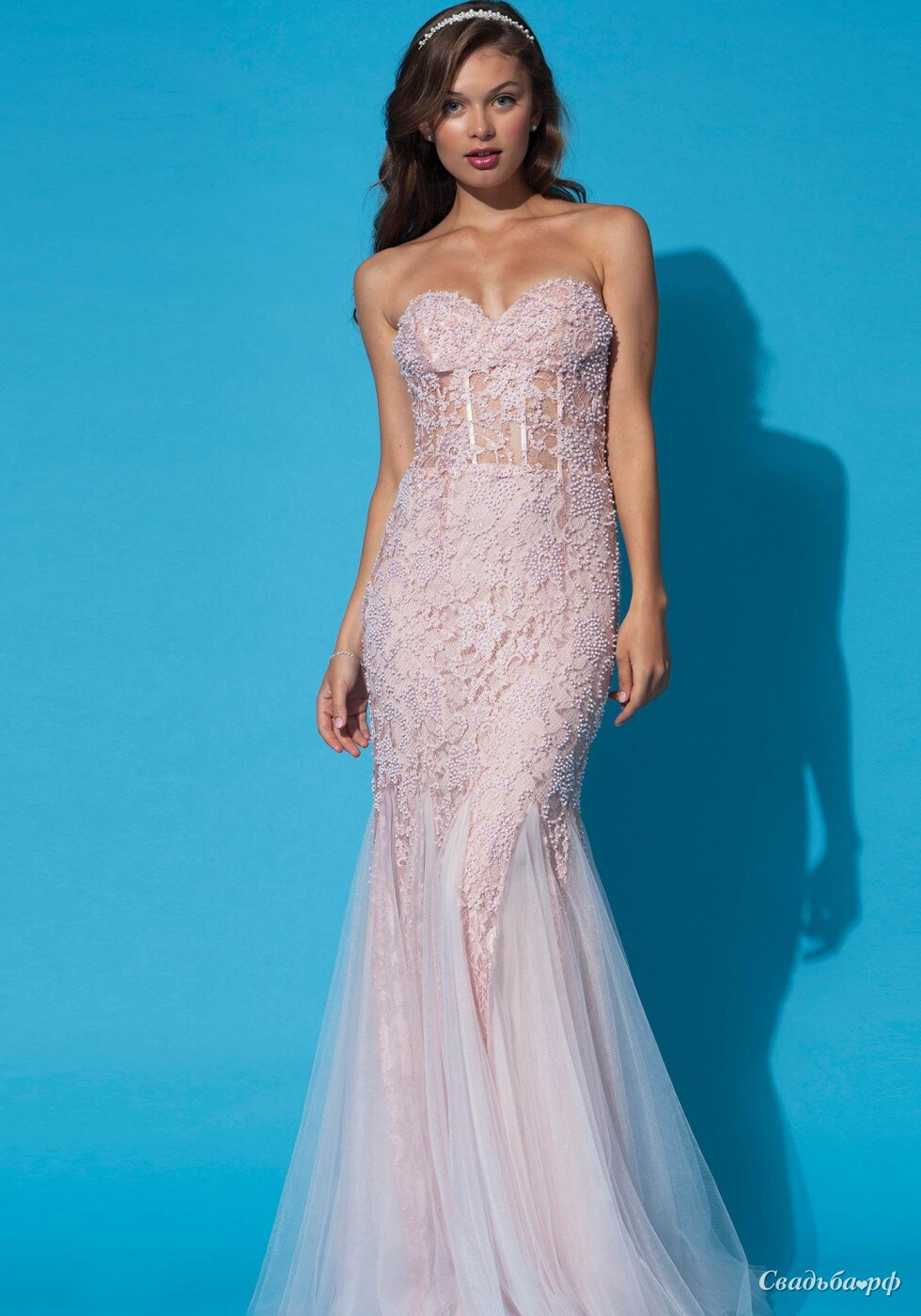 Вечерний наряд от известного бренда Jovani создан для самых дерзких модниц. Облегающий верх платья выполнен из полупрозрачной ткани и украшен тончайшей вышивкой. Такая модель с соблазнительно оголённой зоной декольте акцентирует внимание на бюсте. От уровня колен начинается пышная юбка из лёгкого материала. Небольшой шлейф дополняет образ.