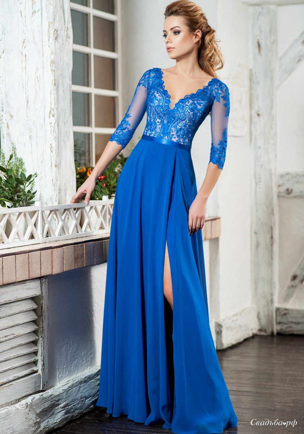 Длинное платье с кружевными рукавами и разрезом по ноге. www.anna-salon.com
