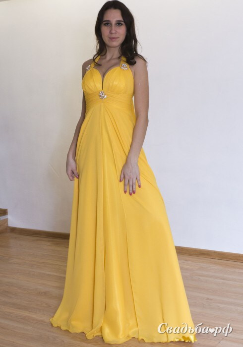 Роскошное платье в греческом стиле, выполнено из шифона. В лиф вставлены чашки push-up (пуш-ап), отделанные шифоном. Украшено брошью по центру лифа и по бретелям. Юбка полусолнце из трех слоев ткани.