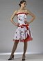 Короткое платье из атласа с рисунком розы. Лиф прямой, открытый. По краю лифа и по заниженной линии талии проходят широкие атласные лента ярко-красного цвета. На боку большой бант. Оригинально оформлена юбка модели (фигурный разрез, нижняя однотонная юбка и широкая шифоновая оборка). Цена от: 10 300 руб. Короткое платье, модель 063.