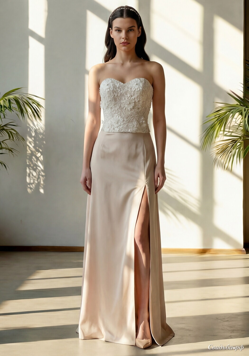 Комплект состоит из атласной юбке облегающего силуэта с разрезом по ноге и корсета из 3D кружева, расшитого жемчугом