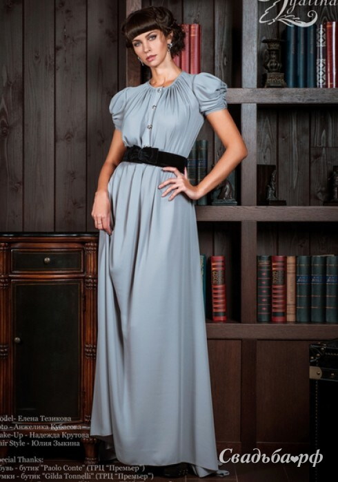 Вечернее платье Сафьяна из коллекции Рассыпающая Звезды... дизайнера Svetlana Lyalina поможет создать утончённый образ настоящей леди. Наряд может похвастаться свободным покроем и рукавчиками-фонариками. Закрытая зона декольте и несколько пуговиц придают платью изысканность. Талия подчёркнута широким поясом чёрного цвета. Юбка струится до пола.