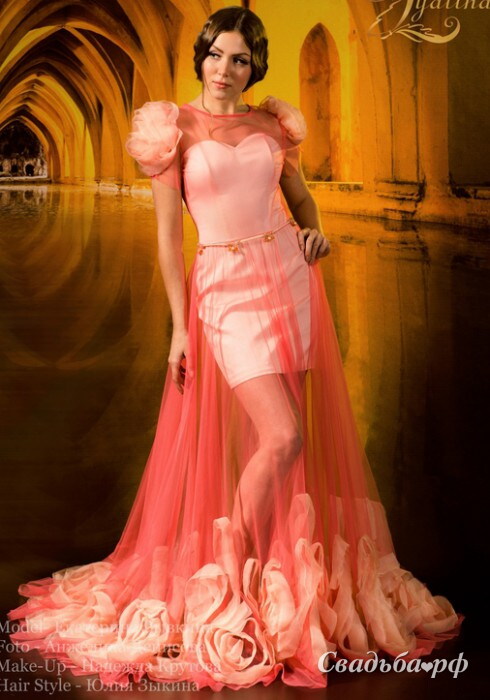 Вечернее платье Меланж из коллекции Рассыпающая Звезды... дизайнера Svetlana Lyalina поражает своей оригинальностью. Облегающий наряд-футляр с открытой зоной декольте дополнен чехлом из полупрозрачной ткани. Объёмная окантовка верхней юбки и пышные рукава придают образу королевский шик. Талия подчёркнута тонким пояском.