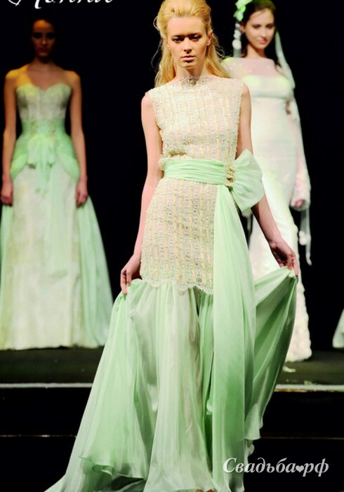 Вечернее платье Нонна из коллекции Шестое Чувство дизайнера Svetlana Lyalina отличается оригинальным фасоном и интересной фактурой. Ажурная часть с закрытой зоной декольте доходит до середины бедра. Пышная юбка и широкий пояс с длинной лентой выполнены из нежнейшей ткани салатового цвета. Наряд выглядит эффектно и неповторимо.