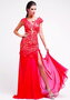 Роскошное красное платье от американского производителя поможет Вам выделиться на любом торжестве. Кружевной на телесной основе корсет придаёт наряду пикантность. Облегающий верх платья выгодно подчёркивает женственные изгибы фигуры. От середины бедра начинается лёгкая юбочка с глубоким разрезом. Наряд дополнен небольшим шлейфом.