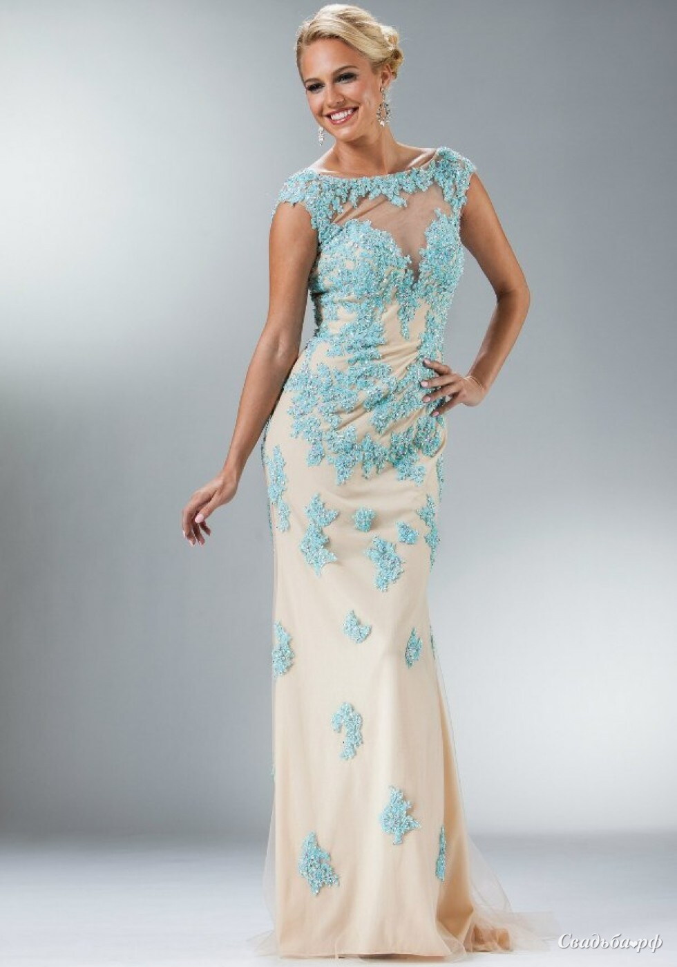 Нежное вечернее платье идеально садится по фигуре и выгодно подчёркивает все её достоинства. Основа бежевого цвета дополнена тончайшей вышивкой нежно-голубого оттенка. Полупрозрачная вставка на груди гармонично сочетается с небольшими рукавчиками и вырезом-лодочкой. Модель зрительно вытягивает силуэт, благодаря длинной юбке прямого покроя.