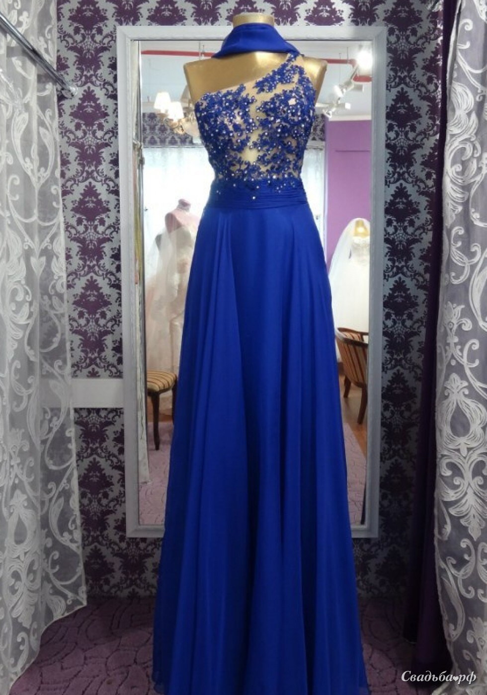 Эффектное платье с единственной бретелью подойдёт для самого торжественного мероприятия. Бежевая основа лифа создаёт эффект открытого тела. Корсет вручную расшит кружевом с пайетками. Длинная юбка свободного кроя струится до самого пола. Глубокий синий цвет представленной модели – хит сезона! Такой цвет скрывает малейшие недостатки фигуры.