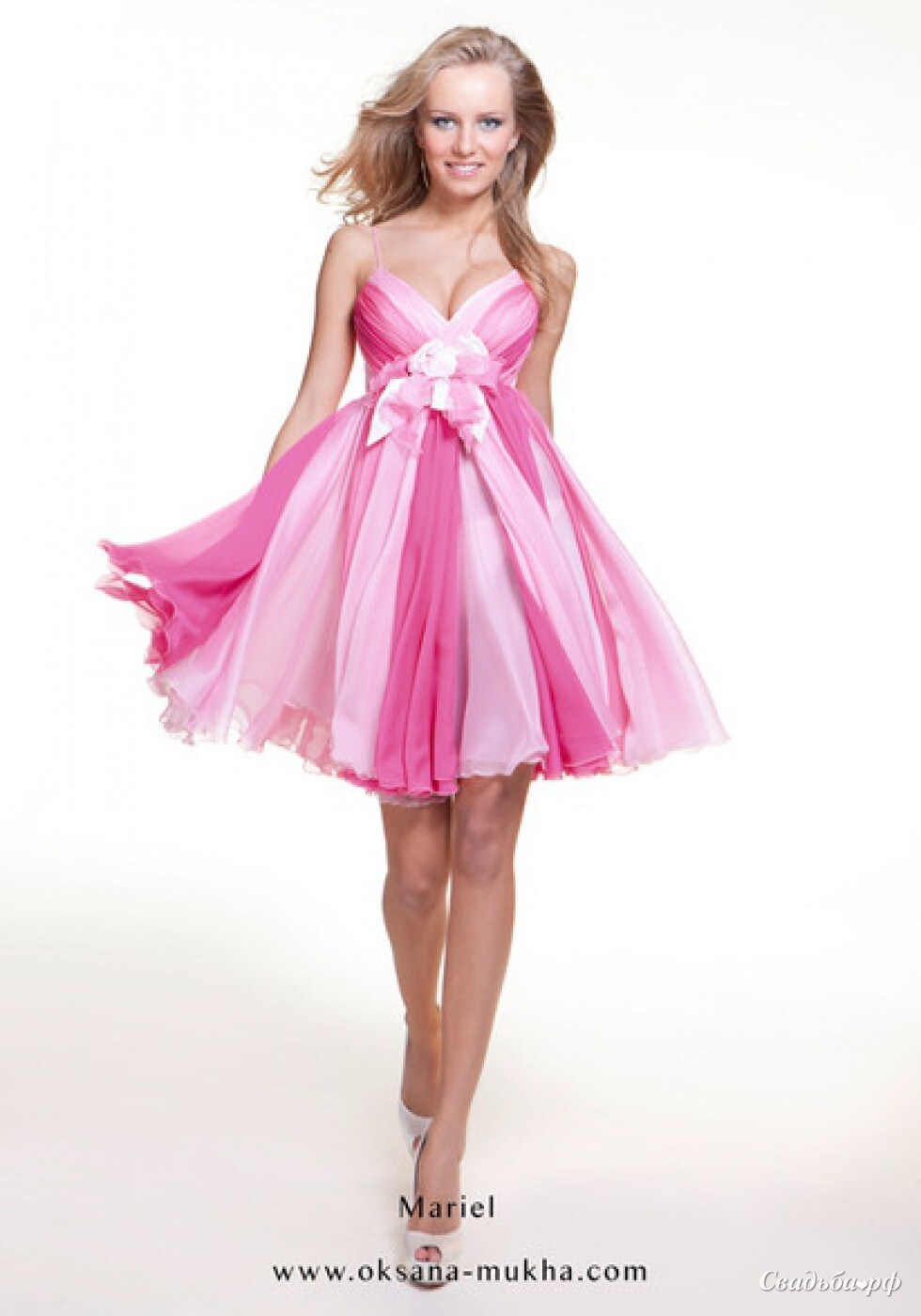 Комбинированное платье с переходами от светло-розового до темно-розового цвета понравится самым жизнерадостным натурам. Этот наряд с тонкими бретелями и соблазнительным вырезом на груди поможет создать игривый и весенний образ! Завышенная талия украшена объёмными цветами. Юбочка-разлетайка едва доходит до середины бедра. Будьте прекрасны!
