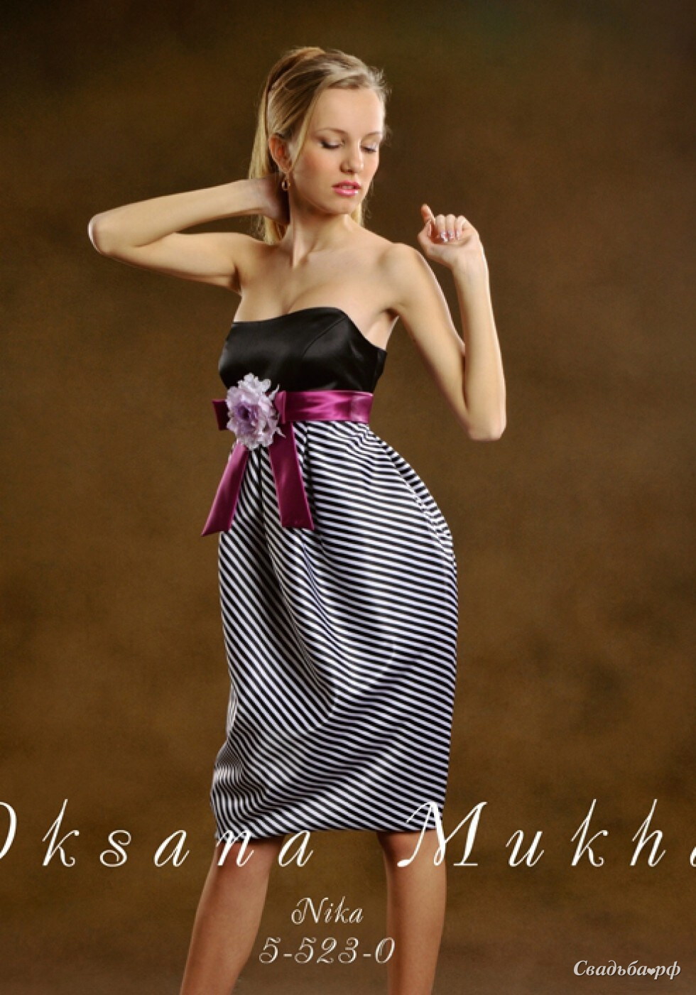 Атласное платье придаст Вашему образу неповторимость. Миниатюрный корсаж с соблазнительной зоной декольте акцентирует внимание на груди хозяйки платья. Завышенная талия подчёркнута розовым поясом с крупным цветком ручной работы. Полосатая юбка до уровня колен смотрится объёмно, благодаря чему Вы сможете скрыть малейшие недостатки фигуры.