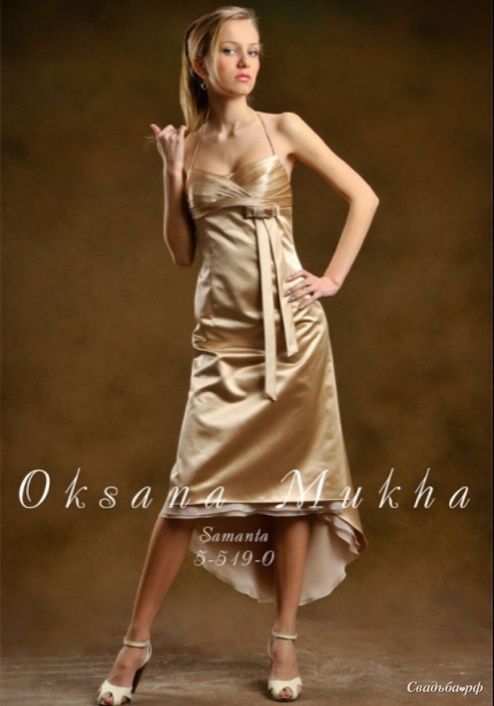 Элегантное коктейльное платье из кремового атласа подойдет для любого торжества. Оголённая зона декольте украшена тончайшими бретелями. Бюст подчёркнут складками драпировки и лентой с бантом. Наряд идеально садится по фигуре и переходит в прямую юбку с краями разной длины. Модель отличается безупречными формами и изяществом.