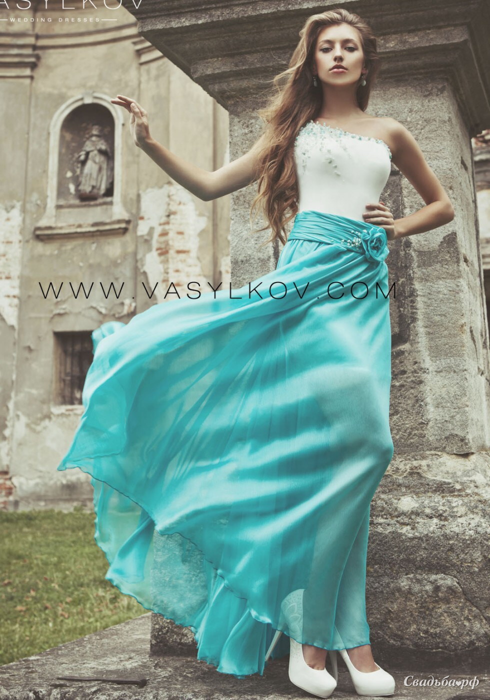 Расшитый корсет с бретелью на одно плечо подчёркивает женственные изгибы фигуры. Летящая юбка придаст Вашему образу воздушность и весеннюю свежесть. Граница между корсетом и юбкой обозначена широким поясом с цветком. В таком роскошном наряде Вы будете казаться ещё выше и стройнее. Покоряйте своей красотой и молодостью всех окружающих.