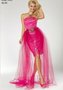 Роскошное короткое кружевное платье цвета аморант. Дополнительной эффектной деталью может стать отстегивающиеся юбка-шлейф. Прекрасный выбор на выпускной бал!