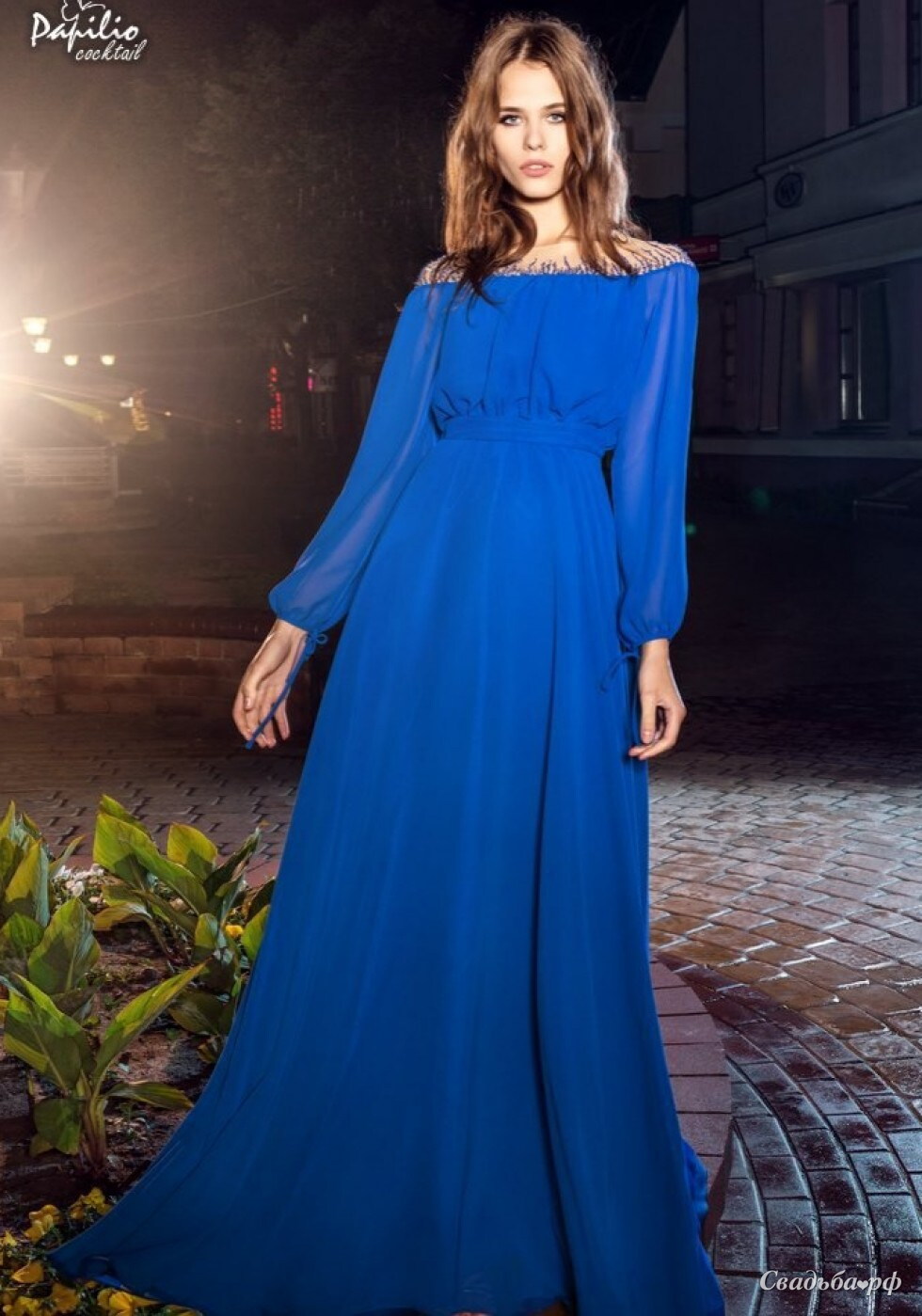 Шифоновое вечернее платье - струящаяся юбка и длинные рукава, декольте завуалировано сеткой и расшито бисером. Коллекция 2017 г.