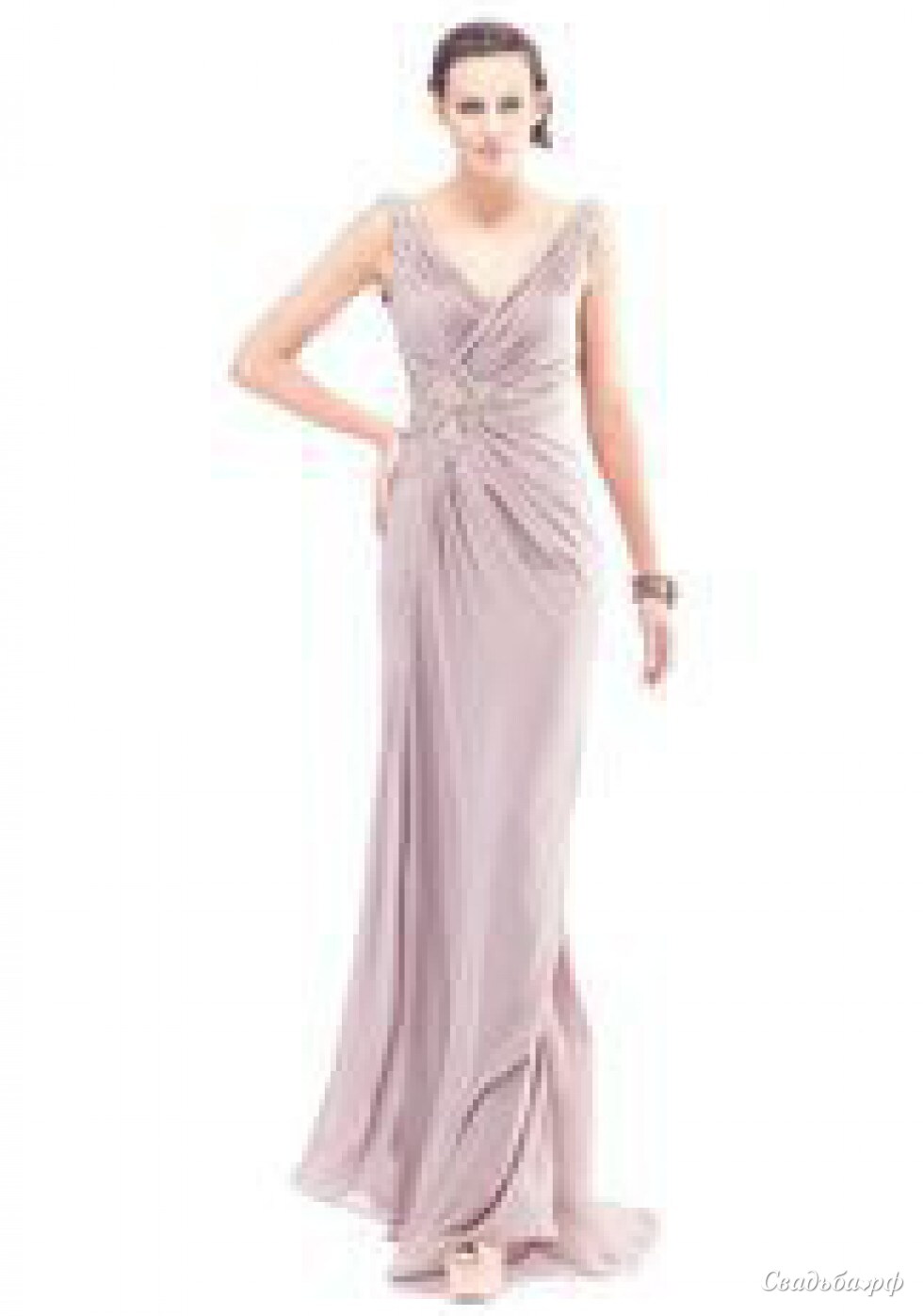 Нежное платье из тонкого шифона выполнено в кремовом оттенке. Глубокий V-образный вырез на груди обрамлён широкими бретелями. Драпировка помогает выделить бюст и выгодно подчеркнуть осиную талию своей обладательницы. Длинная юбка с небольшим шлейфом струится до пола. Роскошная коллекция 2014 года от известного итальянского бренда Ambra Cerimonia.