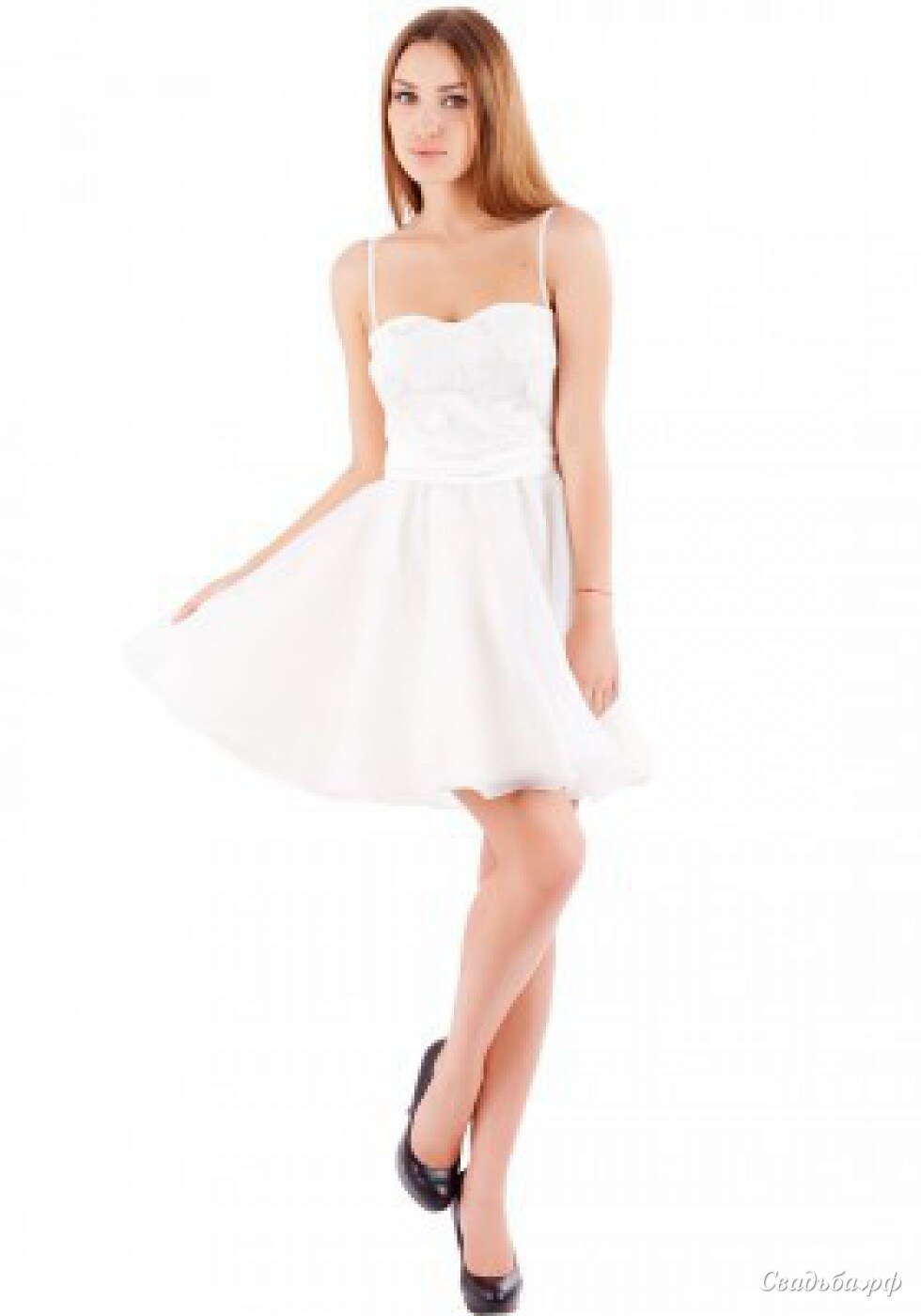 Платье-бюстье средней длины, на тонких бретелях. Силуэт "New Look", с юбкой солнце-клеш и поясом из атласа. Декорировано аппликацией из органзы, вышивкой и пришивными камнями.